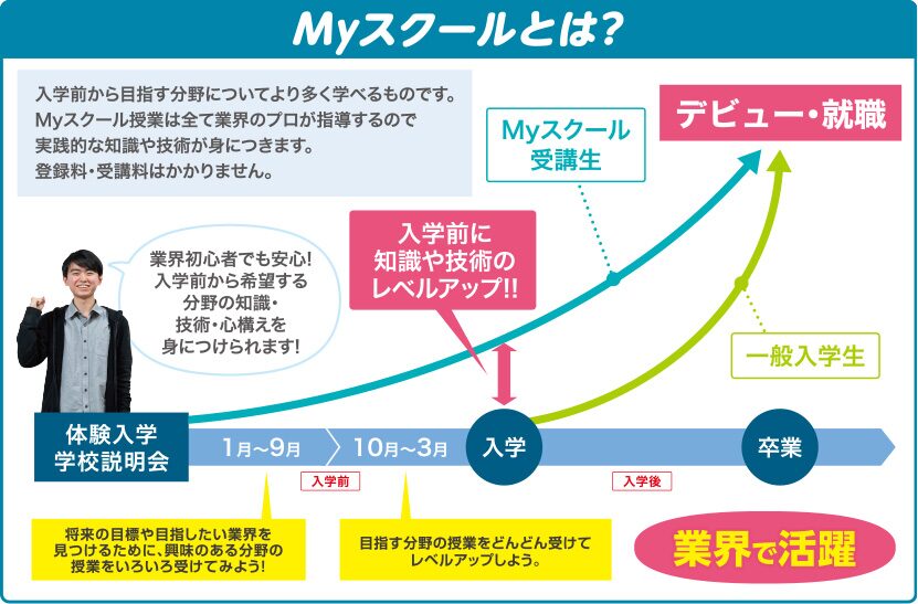 入学前から目指す職業について専門的に学べるものです。レッスンは全て業界のプロが指導するので、実践的な知識や技術が身につきます。登録料・受講料はかかりません。